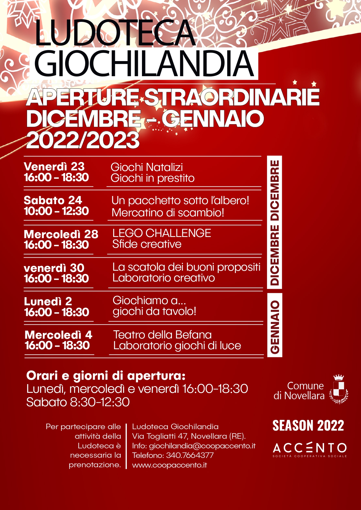 🎄 Aperture straordinarie di Dicembre 2022 e Gennaio 2023 della Ludoteca Giochilandia a Novellara.